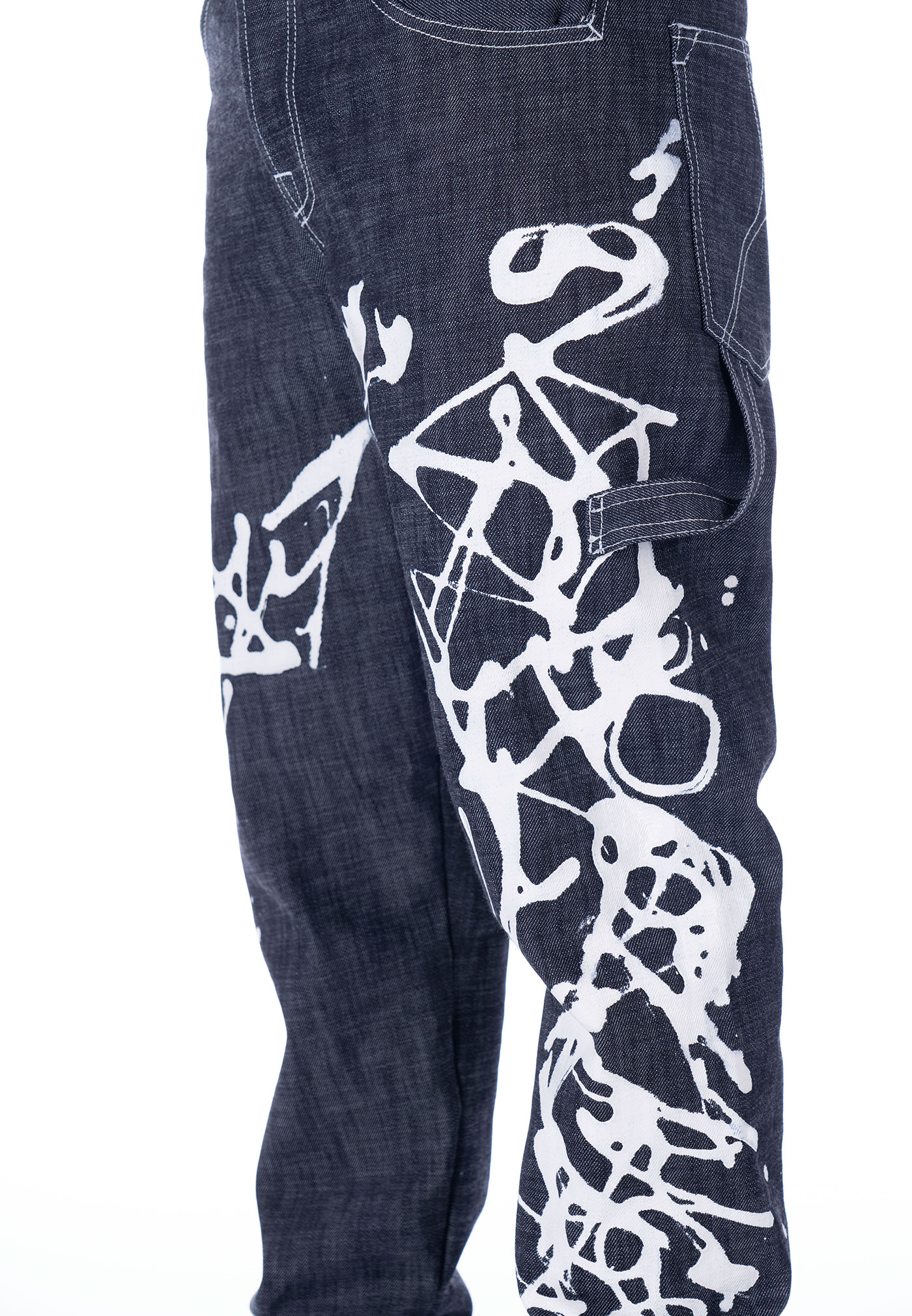 Sulla gamba destra in bianco ho riprodotto Y1, ovvero il grado conferitomi da Rammellzee in qualità di suo discepolo, sulla gamba sinistra la scritta corsiva (scripto continva) KEEP ROCKING posizionata per la lunghezza seguendo un’ andatura lineare da sinistra verso destra, con i grafemi rafforzati da elementi grafici come frecce ed altri simboli celati, cosi’ da rendere la scritta di forte impatto emotivo.