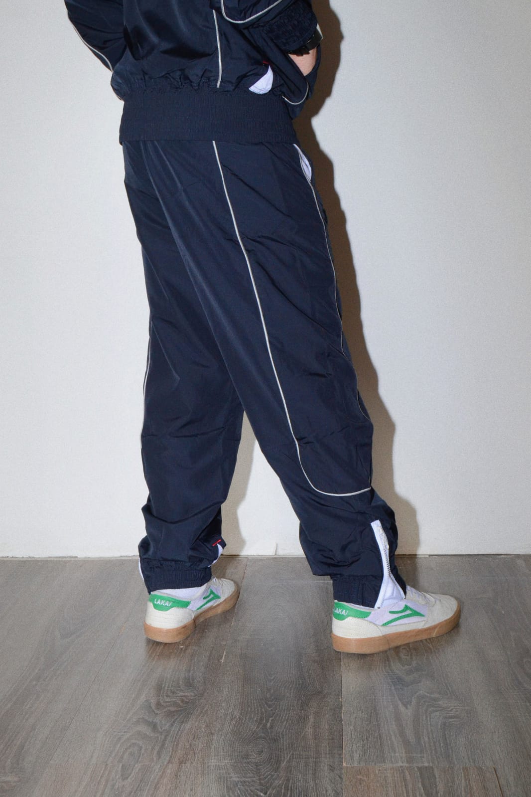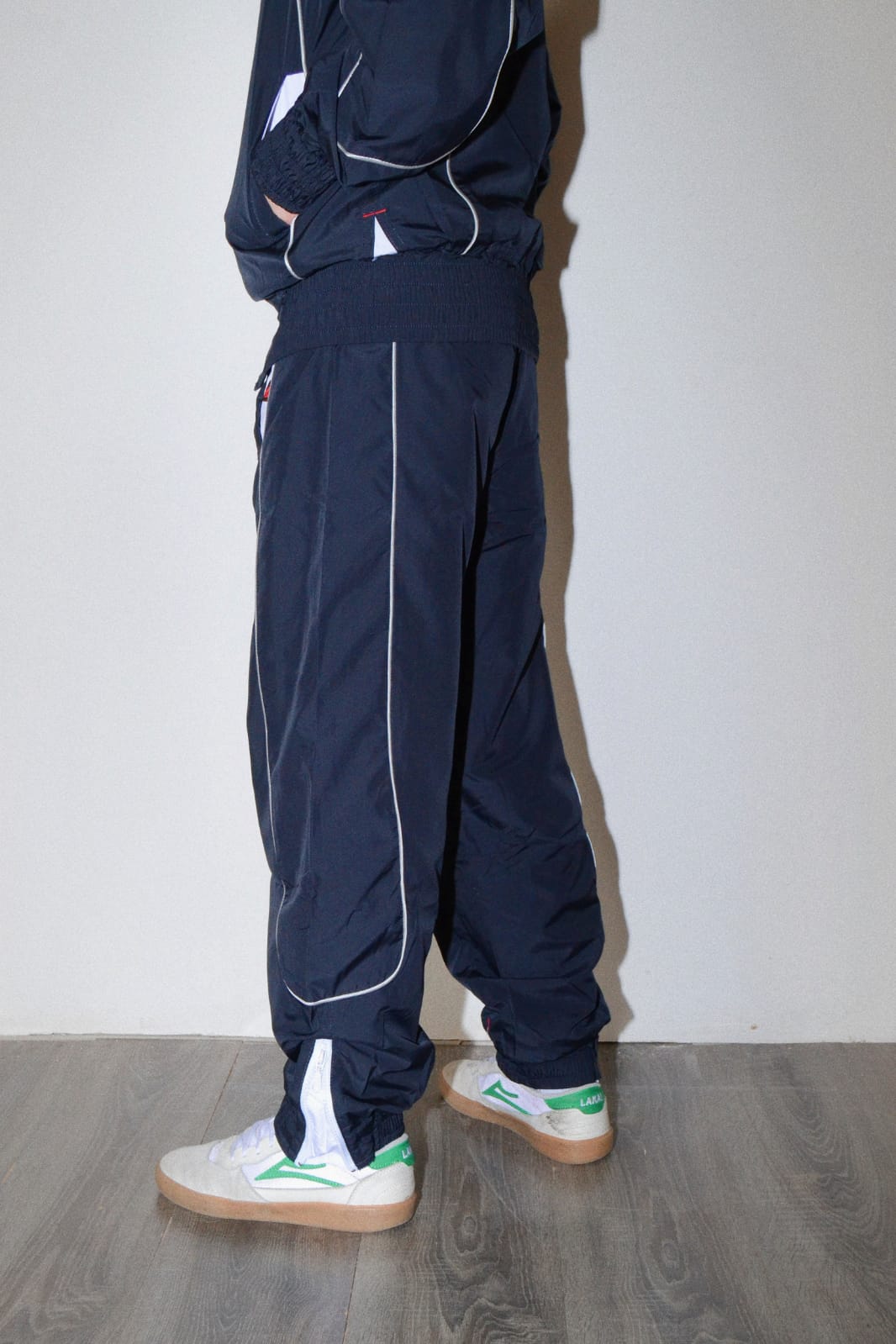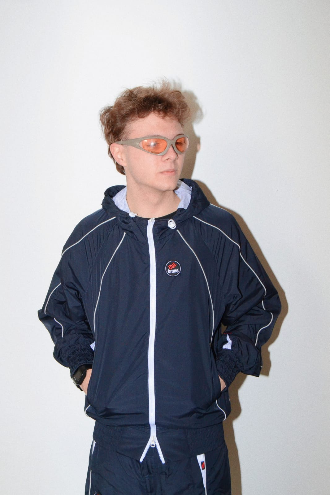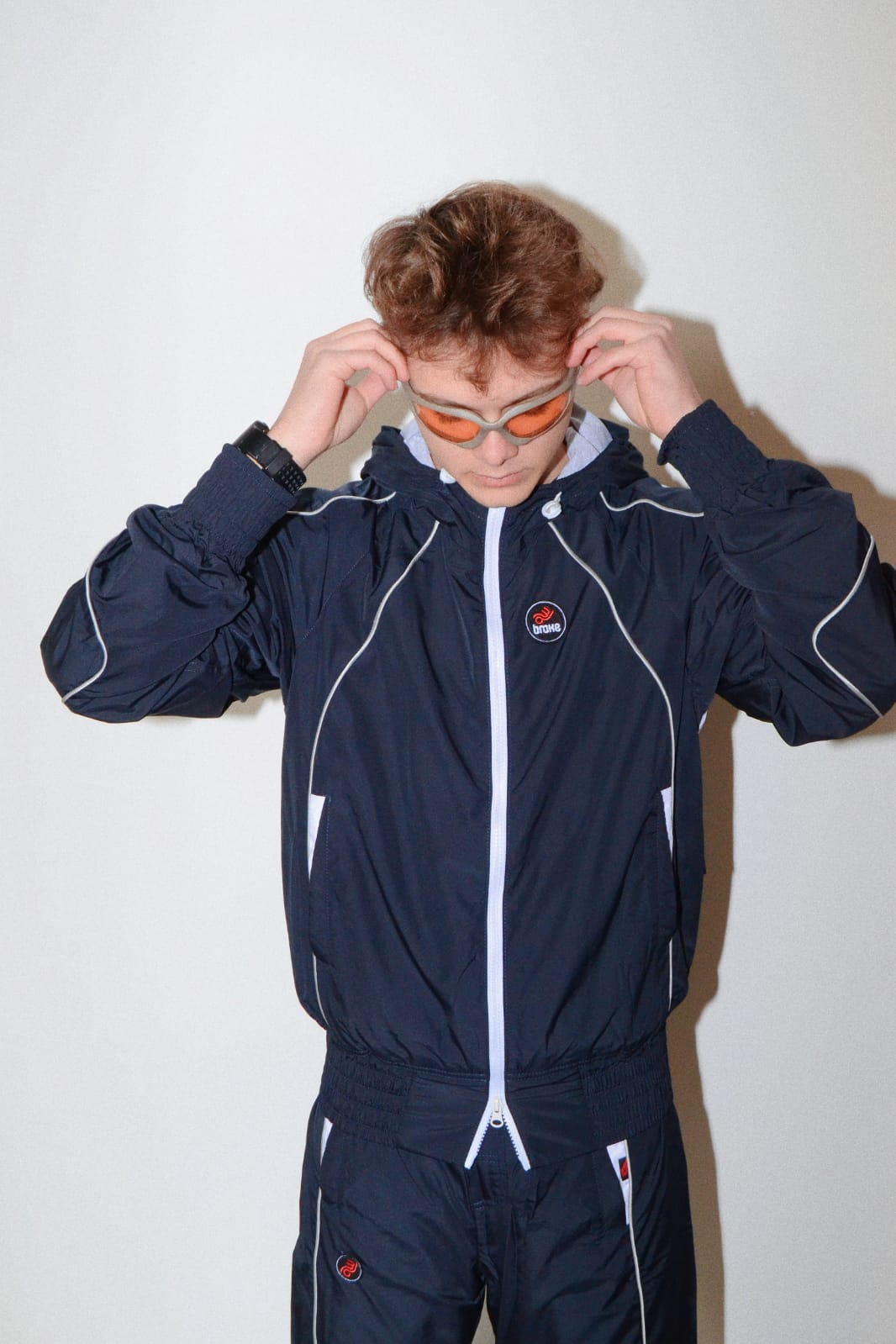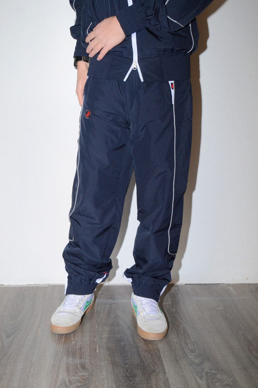 Tuta in Nylon con interno in jersey , logo Broke ricamato zip su fondo pants, colore blue.