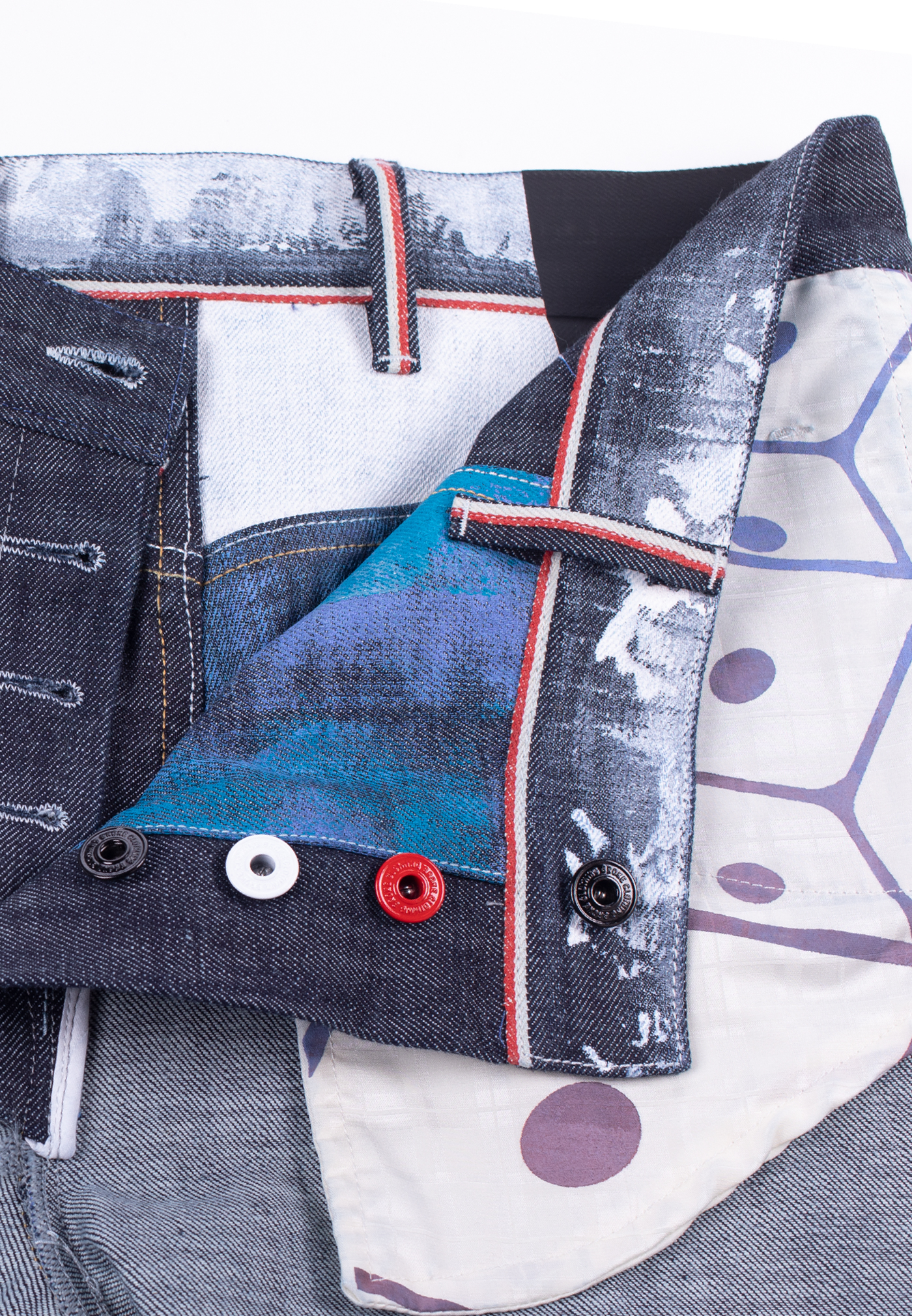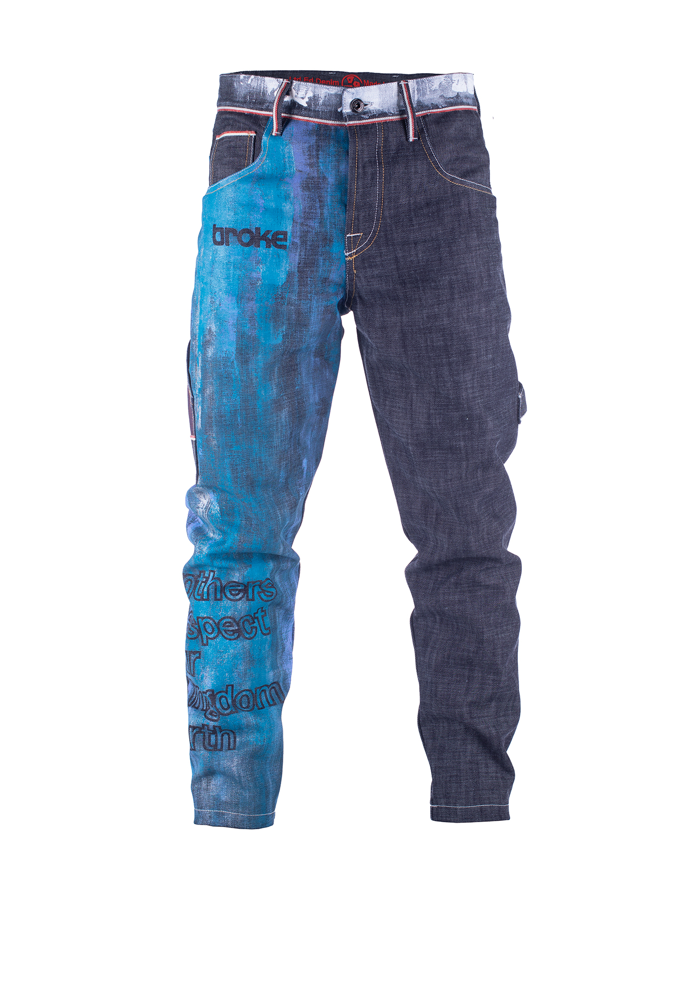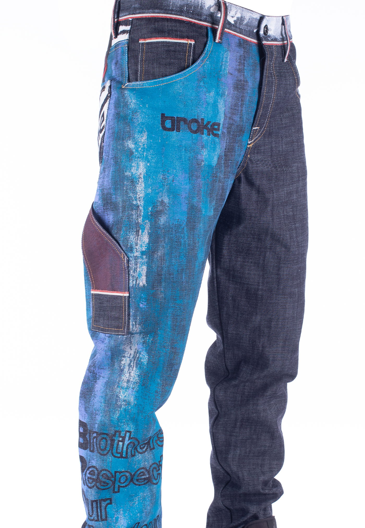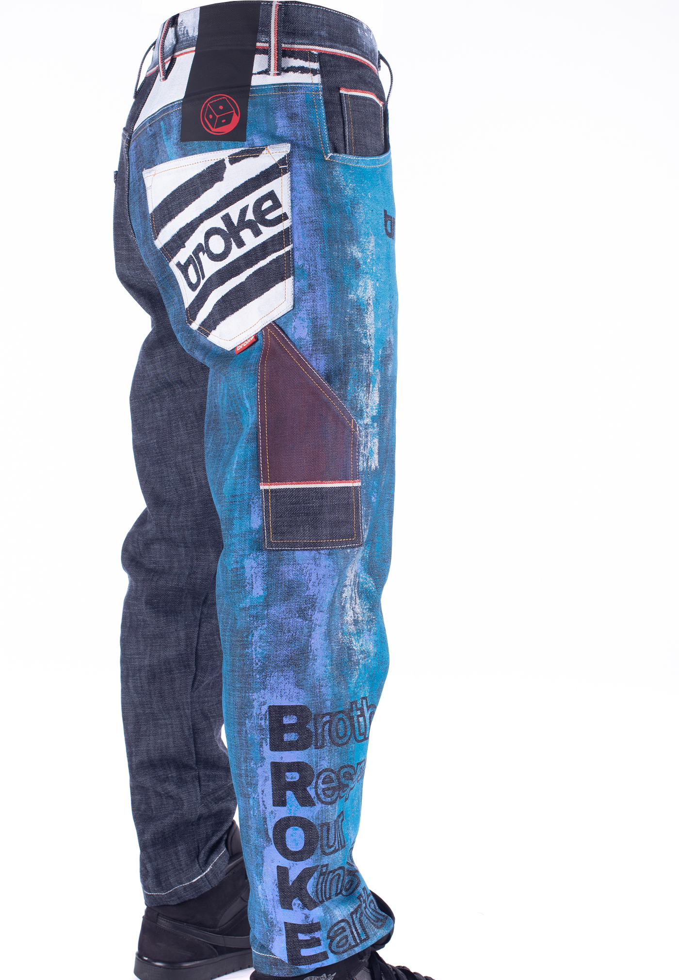Il nostro Broke 360 è una re-interpretazione del Carpenter’ jeans con un fit contemporaneo e senza cuciture esterne. Bottoni personalizzati heritage smaltati a broke palette. Ricamo interno logo Best. Prodotto interamente in Veneto. Denim cimossato 14,5 oz. Indaco 100% cotone con effetto crosscheck. Non lavato. Cimossa che ruota tutto attorno alla vita a 360 gradi. Fodere tasche in seta e lana dipinte a mano con macro logo ‘rolling dice’, numero serie limitata. Dipinto a mano ‘all over’ gamba destra con acronimo Broke. Cintura dipinta a mano effetto gesso “eroso”. La taglia indossata dal modello è una 32 (alto 1,82).