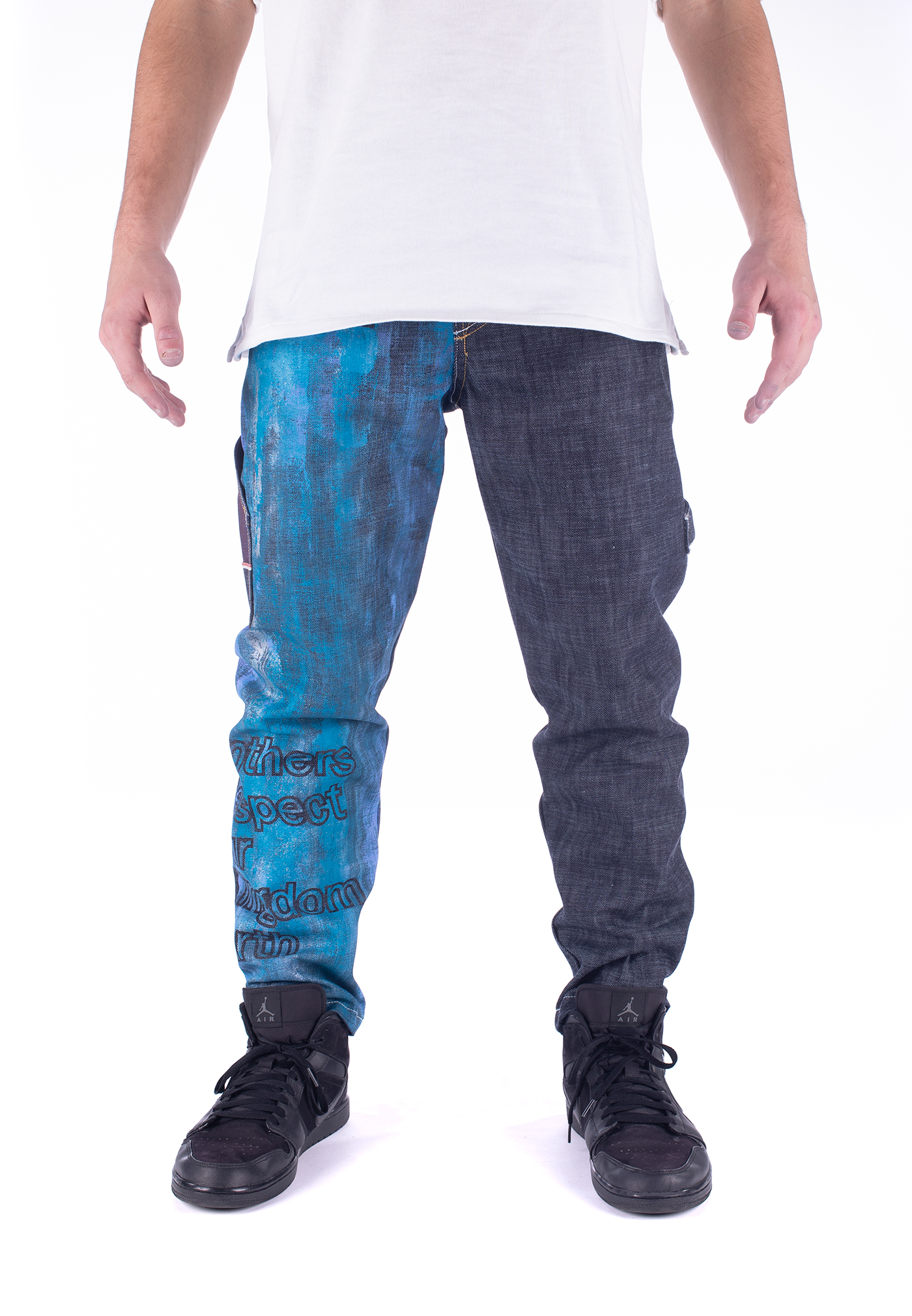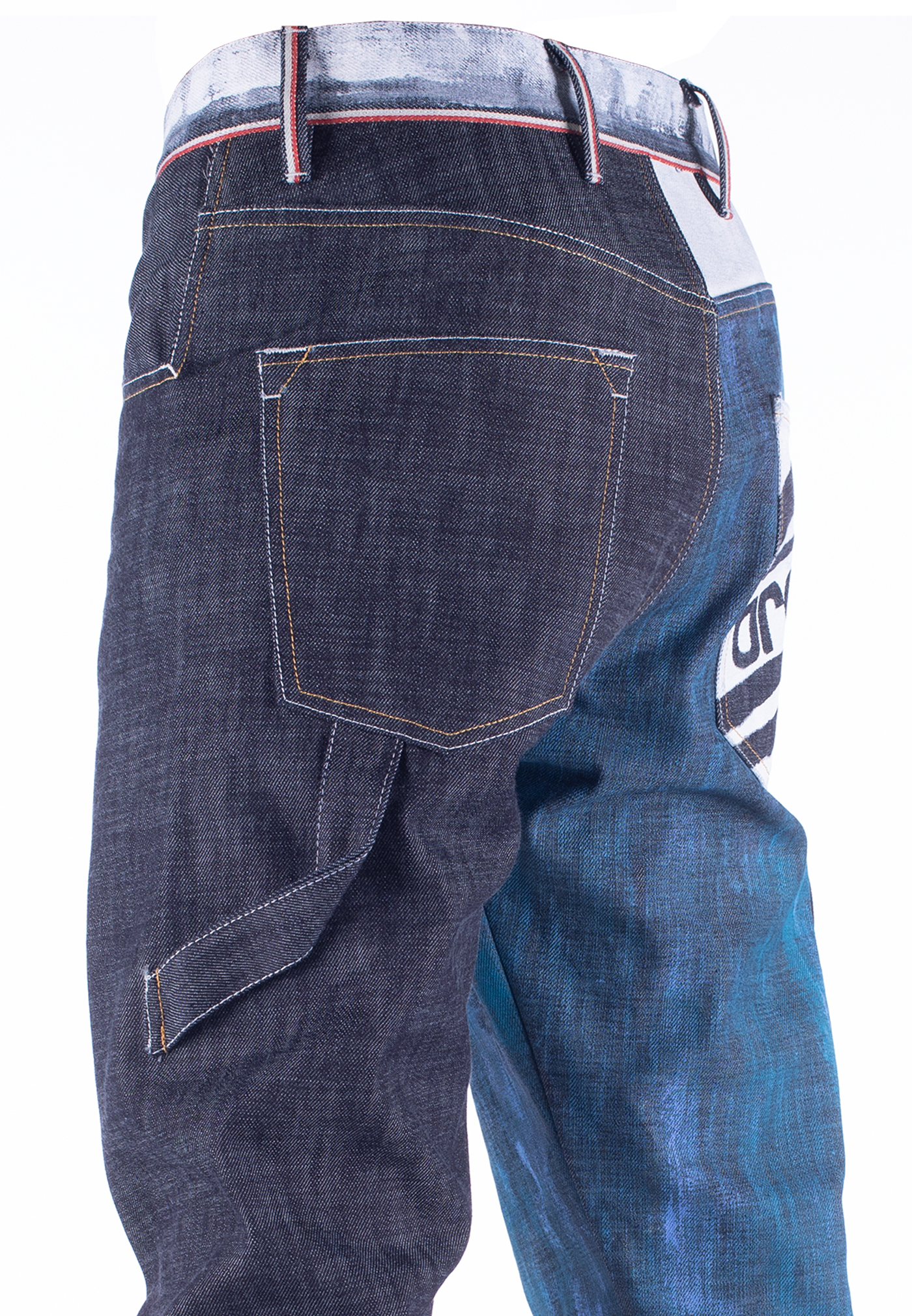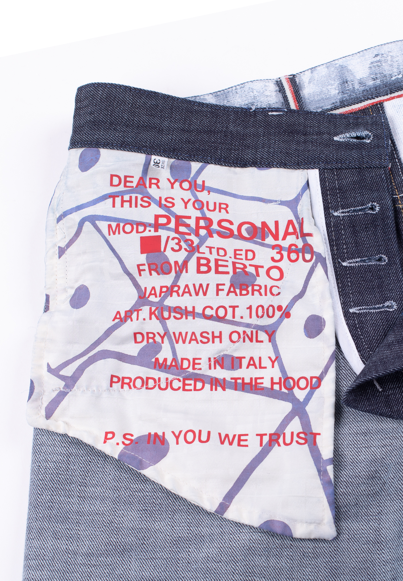 360 è una nostra interpretazione libera del pantalone da lavoro con un fit contemporaneo ed internazionale. Denim 14,5 once cimosato, come il classico workers’jean. Cimossa che gira attorno alla vita, nostro brevetto. Dipinto a mano con effetto gesso eroso. Dipinto all over con grafica b.r.o.k.e.. Serie limitata di 33 pezzi.