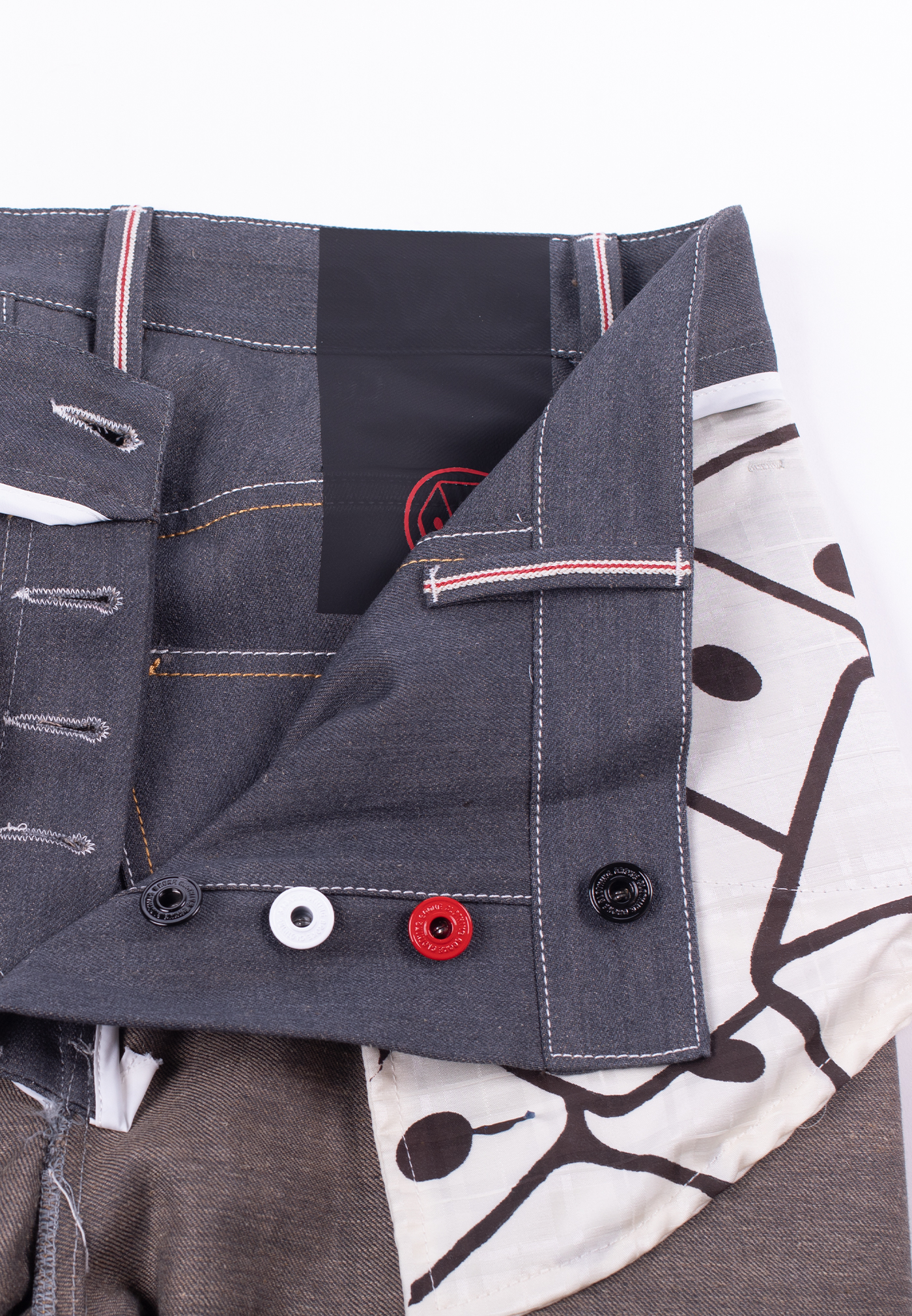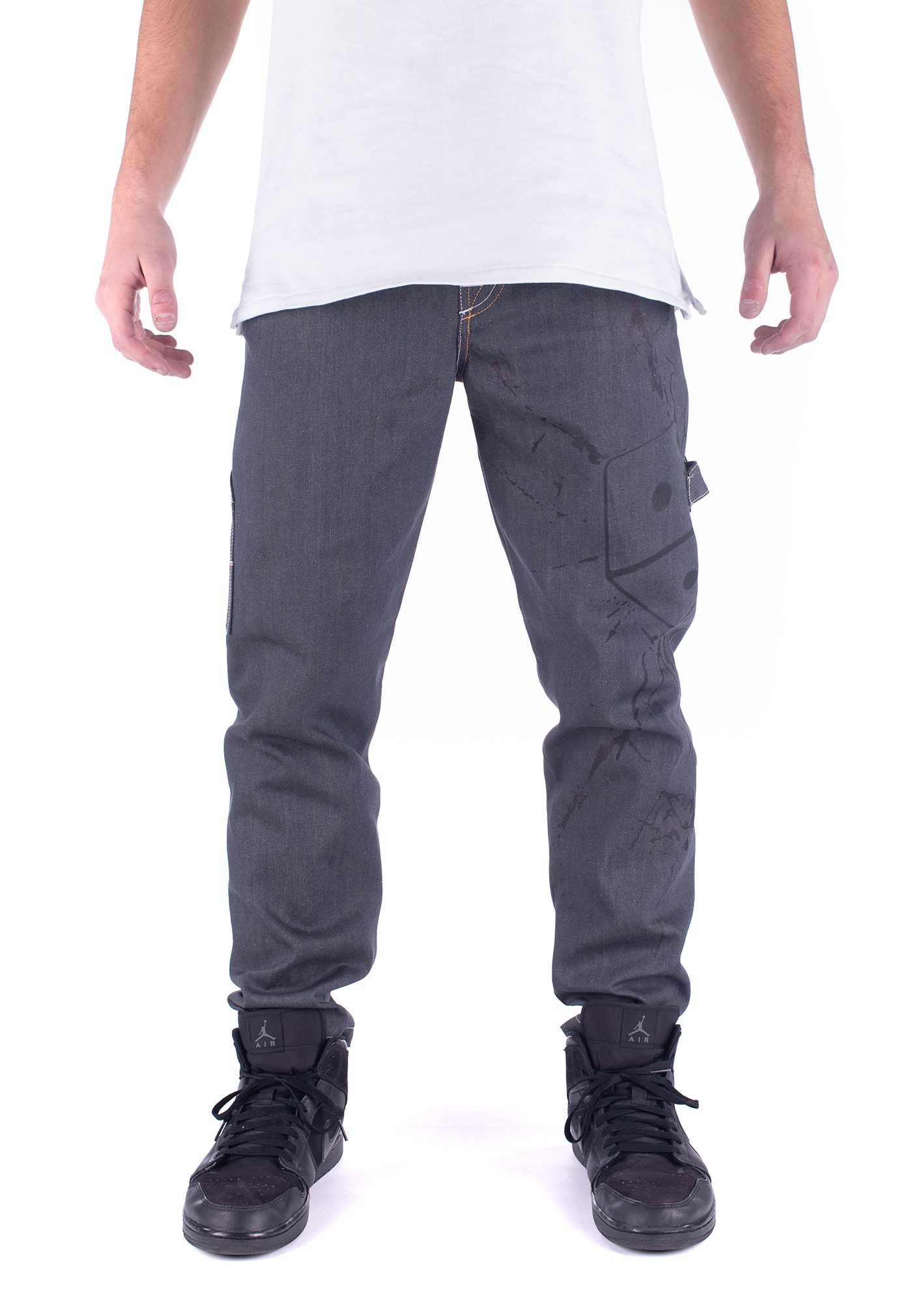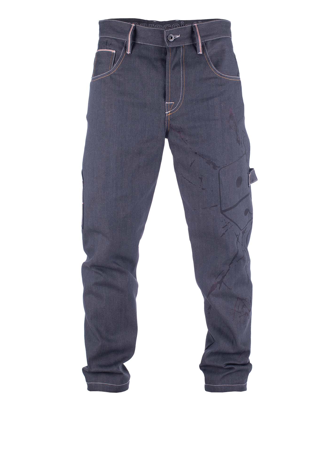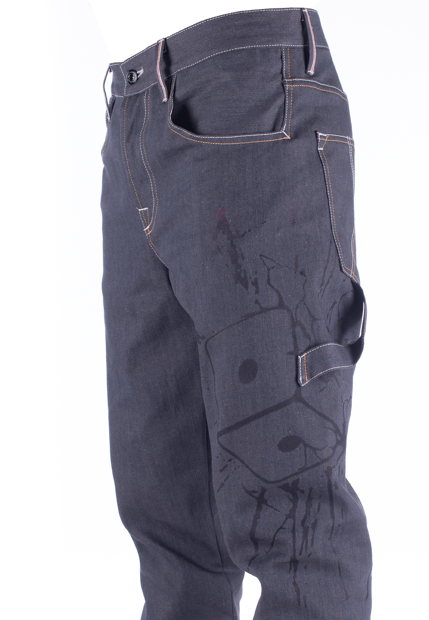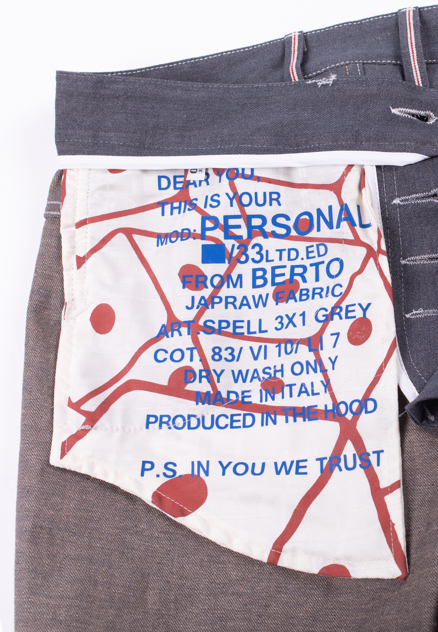 Il nostro Personal è una re-interpretazione del ‘work ‘con un fit leggermente baggy, senza cucitura esterna e stretto sul fondo. Bottoni personalizzati Broke heritage laccati, bordatura interna e mezzaluna sartoriale ricamata. Nuovo logo tasche “mega dice”. Prodotto interamente in Veneto. Denim cimossato grigio di cotone pettinato con trama in lino e viscosa. Non lavato. Fodere tasche in seta e lana dipinte a mano con macro logo ‘rolling dice’. Dipinto a mano sulla gamba sinistra e tasca destra con macro logo ‘wise or wounded’. La taglia indossata dal modello è una 30 (alto 1,82).