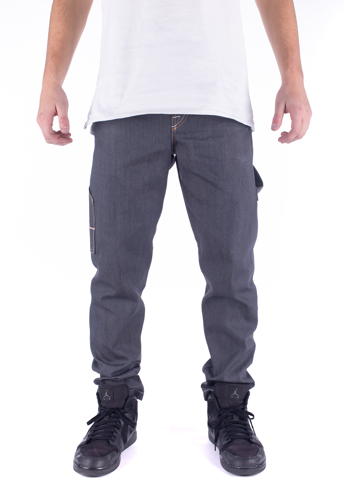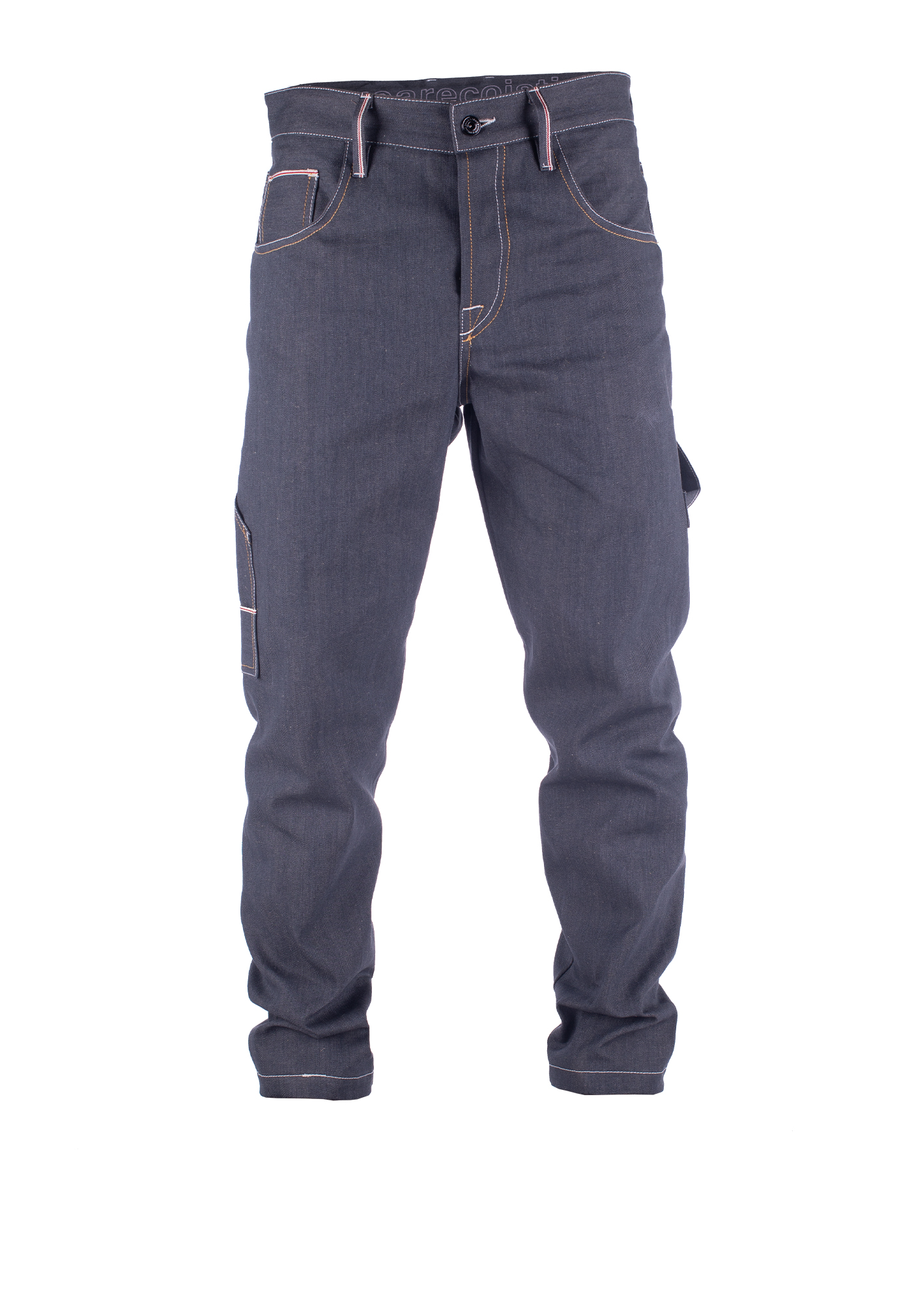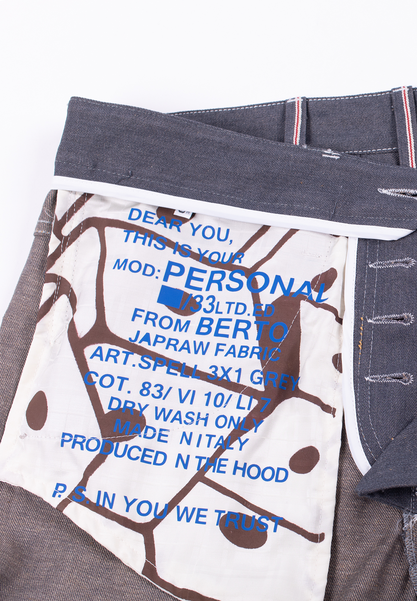 Re-interpretazione del ‘work ‘ Broke con un fit l internazionale, leggermente baggy, senza cucitura esterna e stretto sul fondo. Denim cimossato grigio, effetto “porfido” 11,5 once con trama in lino e viscosa. Raw denim a serie limitata di 33 pezzi.