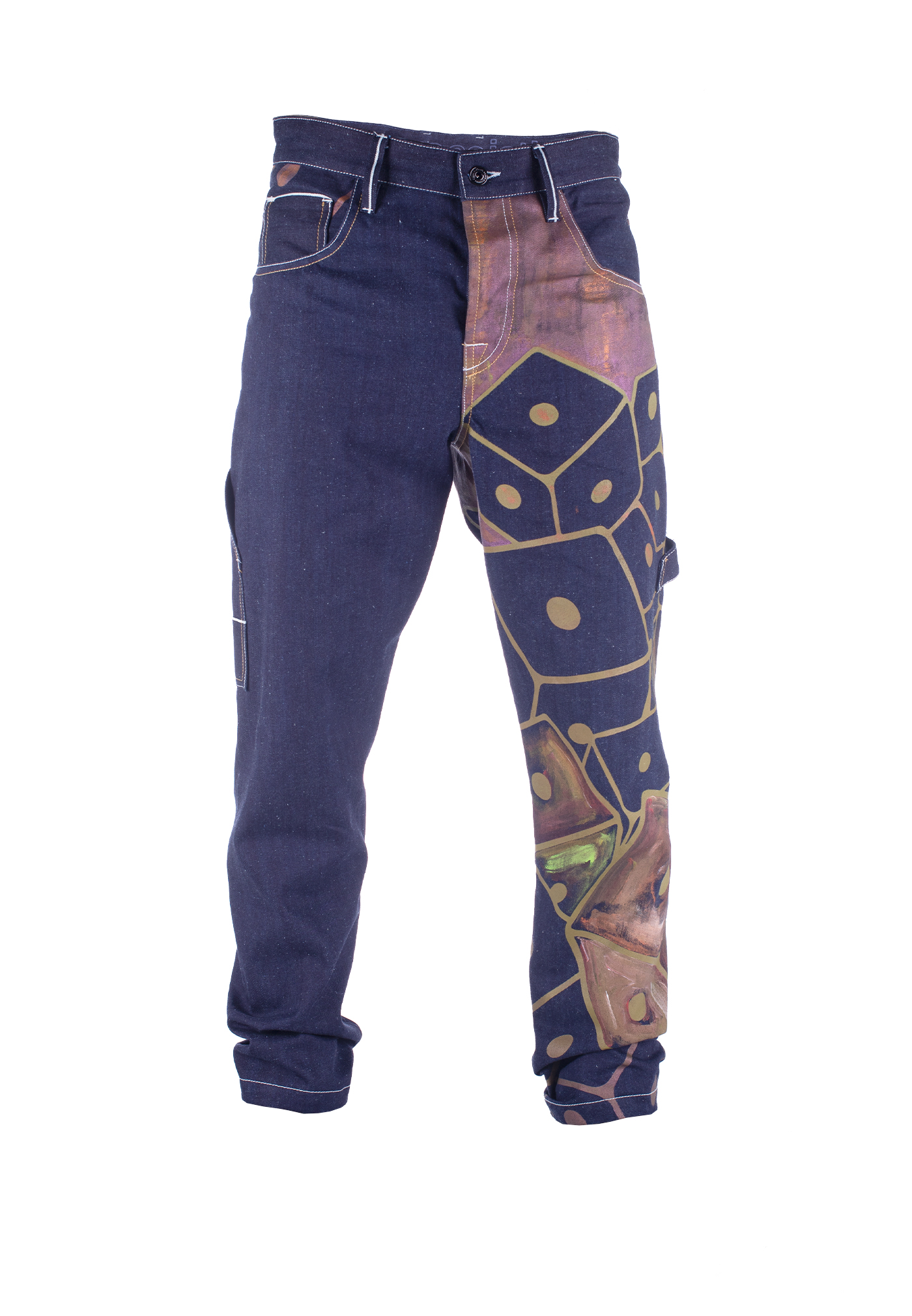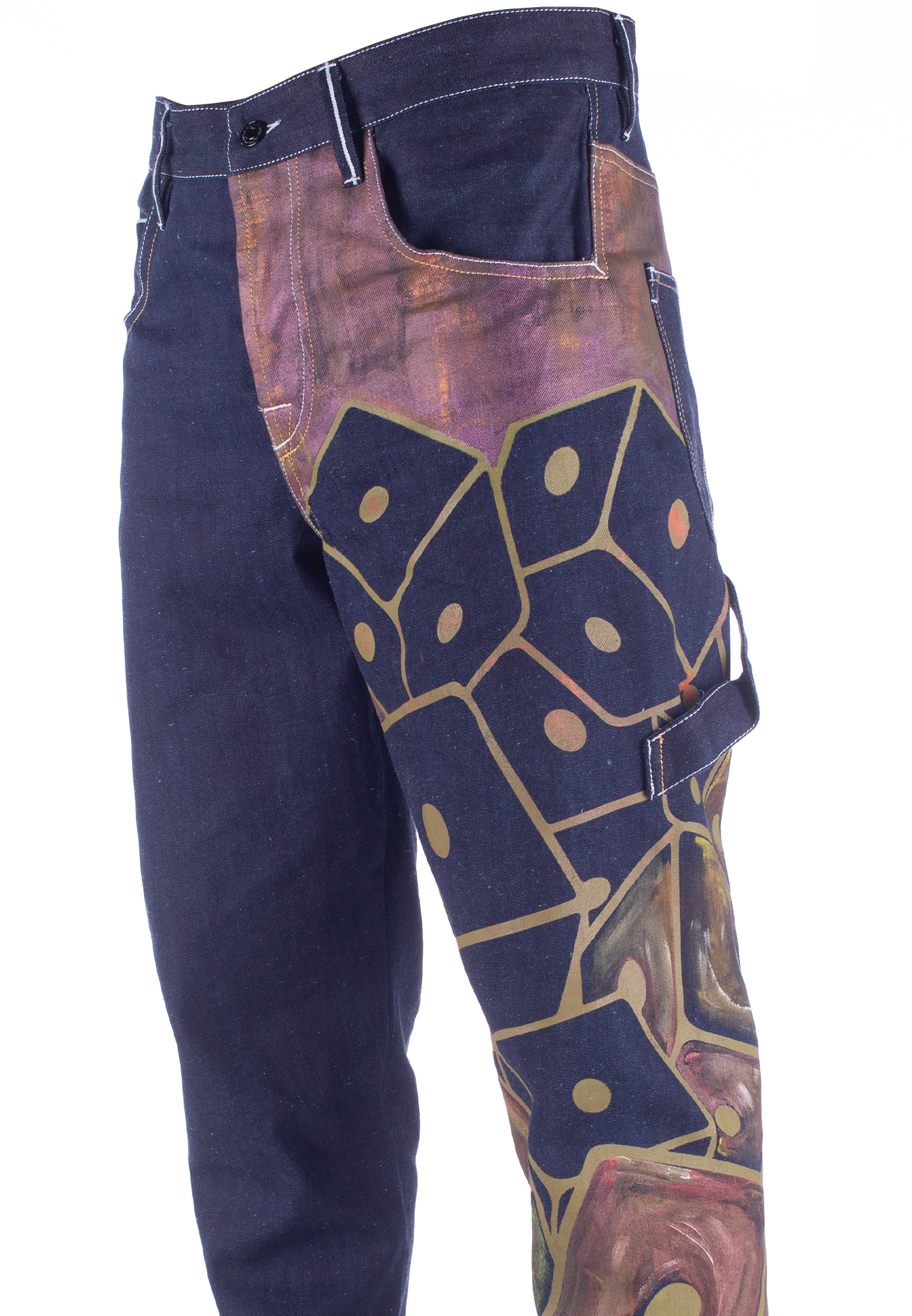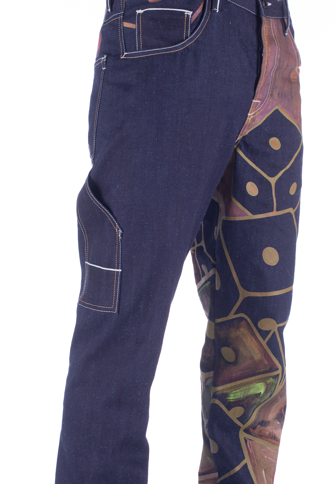 Personal è una re-interpretazione del Carpenter’s jeans con un fit contemporaneo, leggermente baggy e senza cucitura esterna. Dipinto a mano all over con grafica “space dices” che rappresenta il nostro viaggio mistico alla ricerca di consapevolezza e comprensione. Denim cimossato bottonato. Non lavato. Capo unico a serie limitata di 33 pezzi.