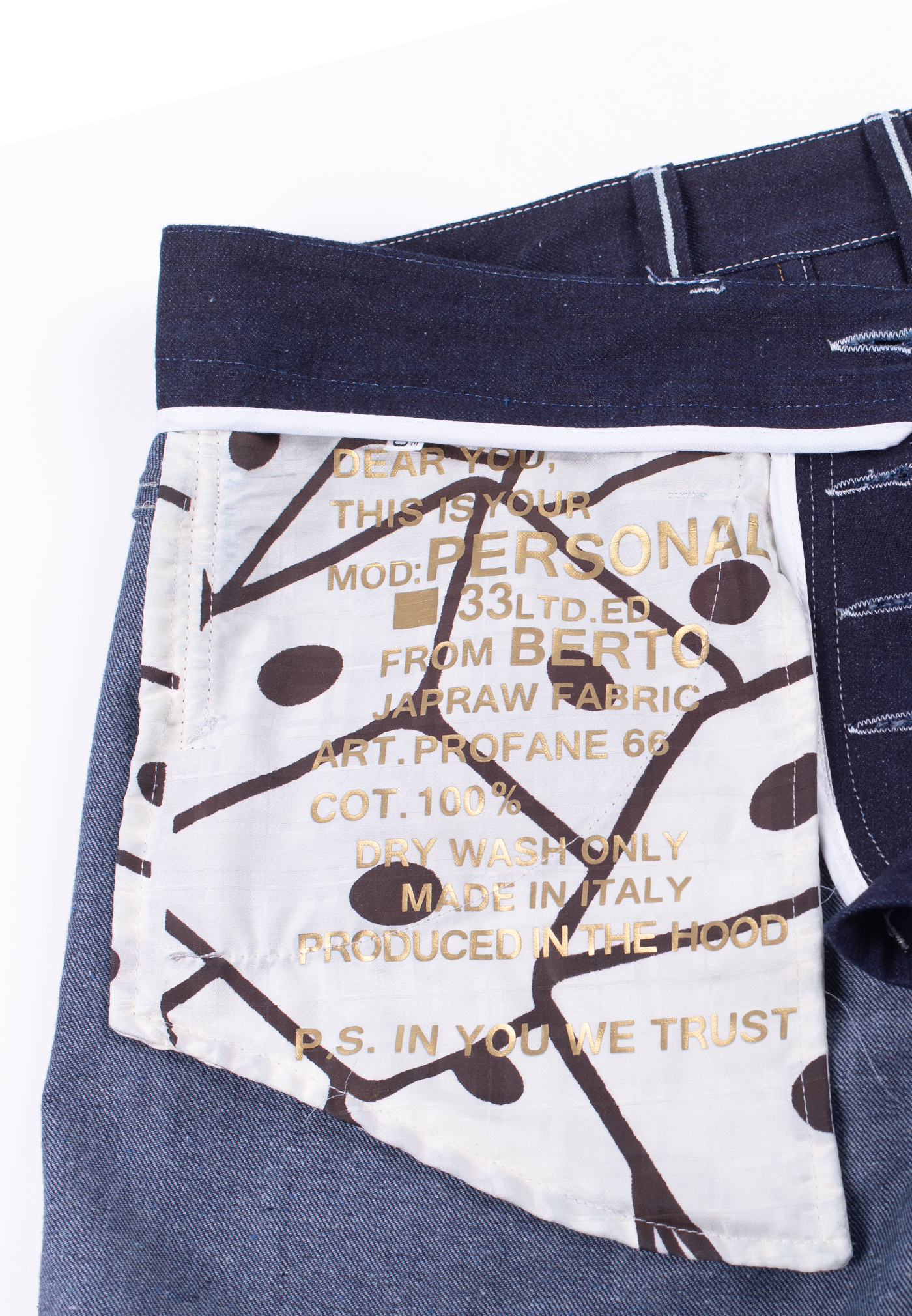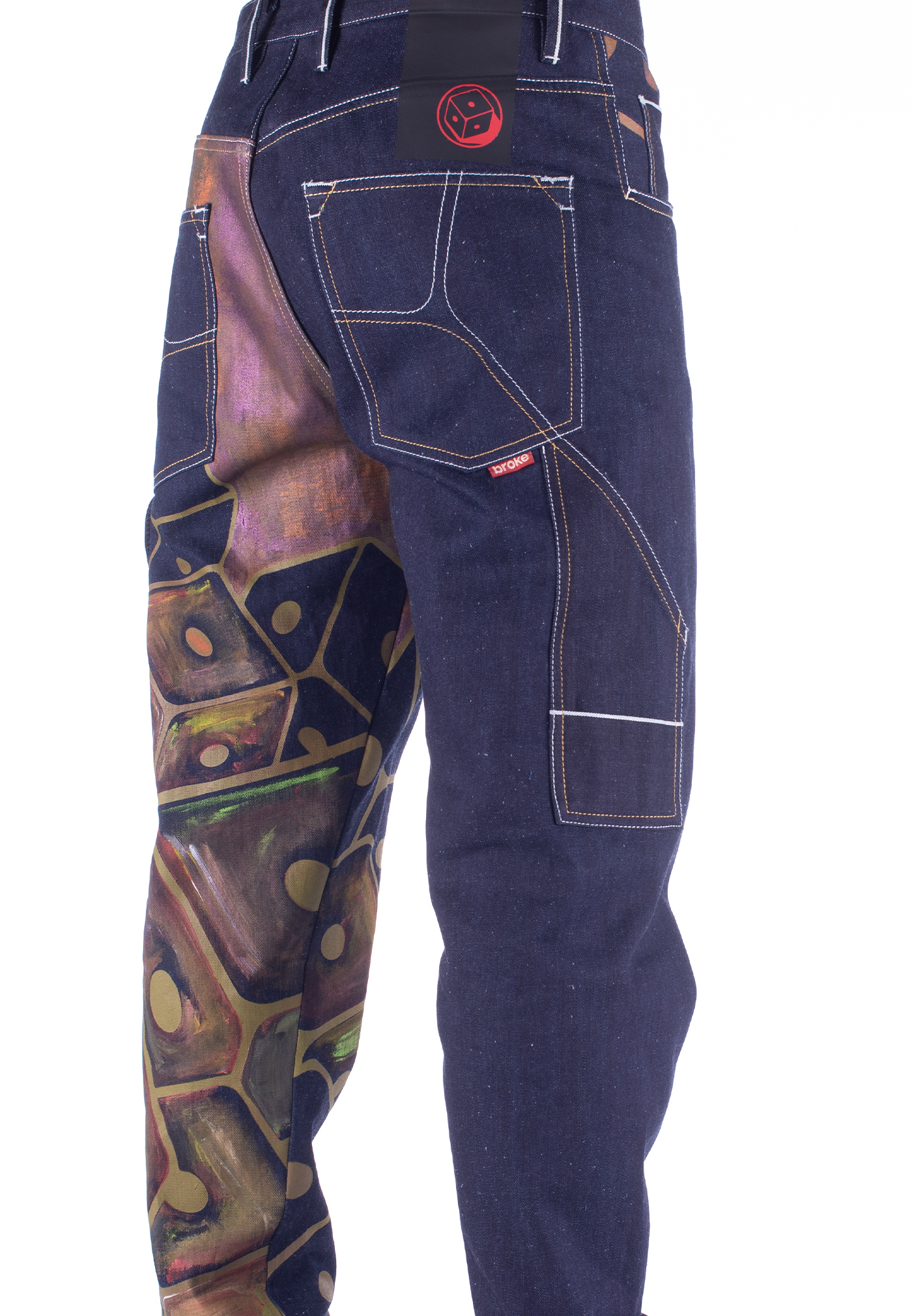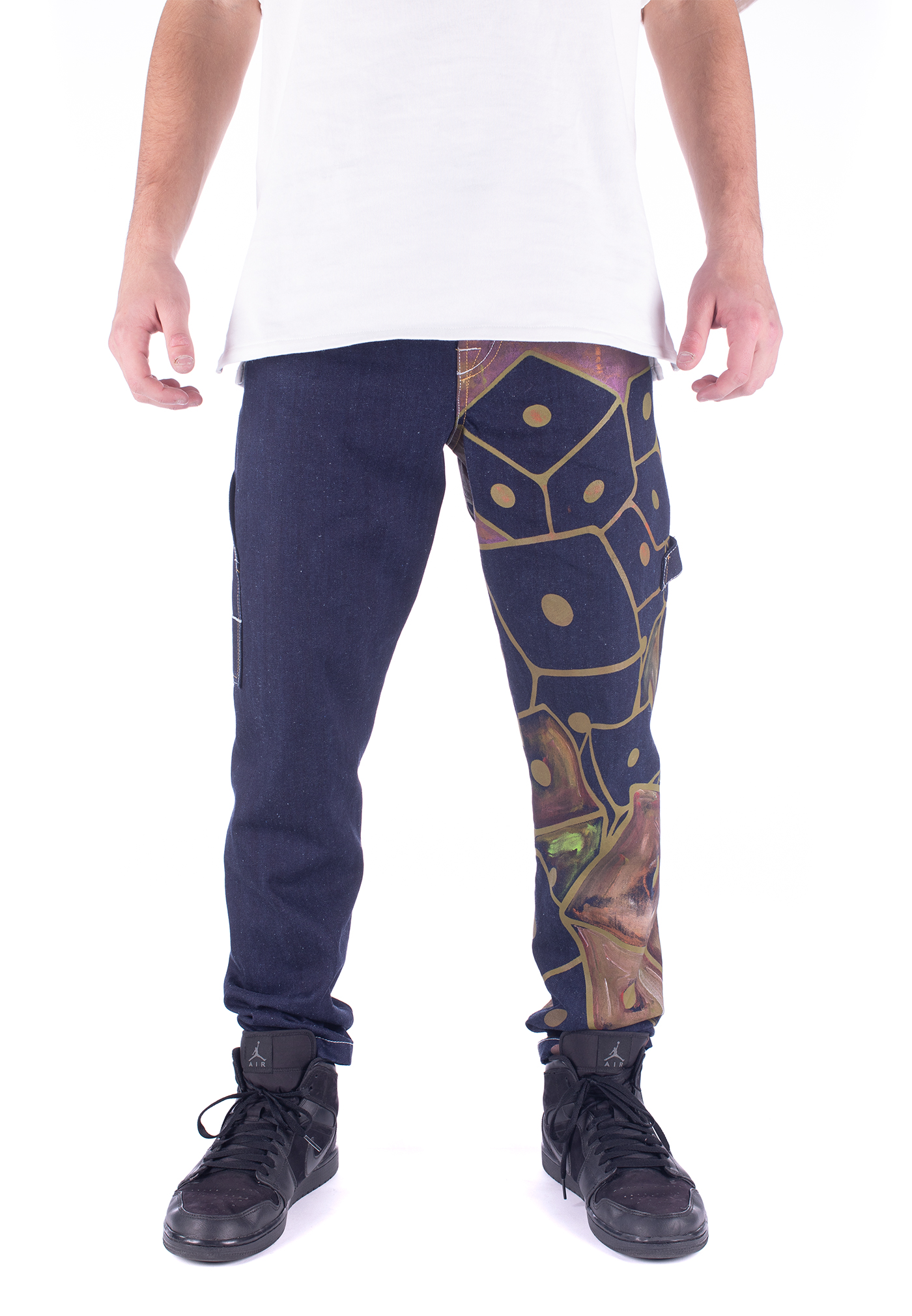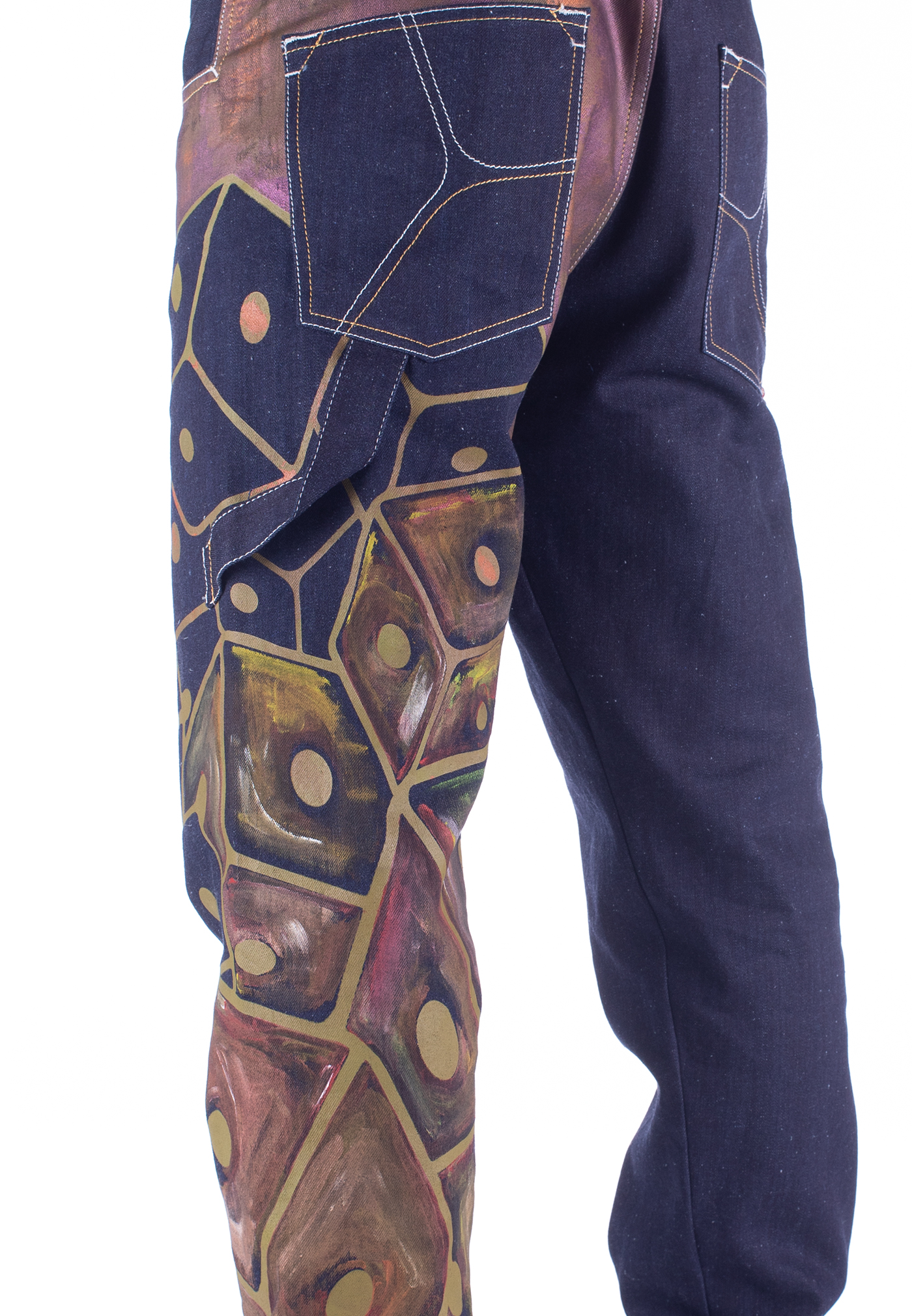 Personal è una re-interpretazione del Carpenter’s jeans con un fit contemporaneo, leggermente baggy e senza cucitura esterna. Dipinto a mano all over con grafica “space dices” che rappresenta il nostro viaggio mistico alla ricerca di consapevolezza e comprensione. Denim cimossato bottonato. Non lavato. Capo unico a serie limitata di 33 pezzi.